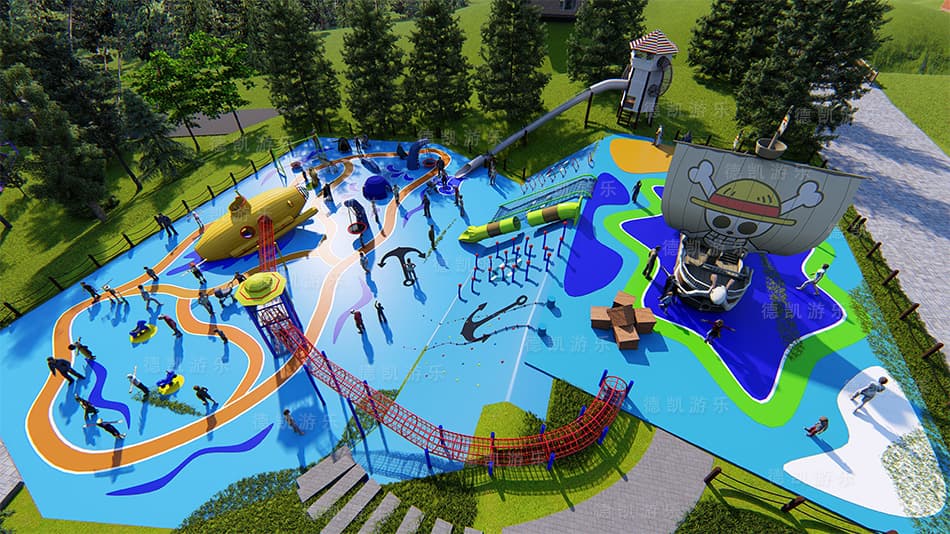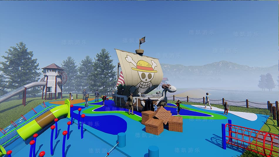 主要顯示海盜船和裝寶藏的箱子的細節,間接顯示斜坡的傾斜度,斜坡上設備的細節,還有遠處草坪上充滿探險滑梯。